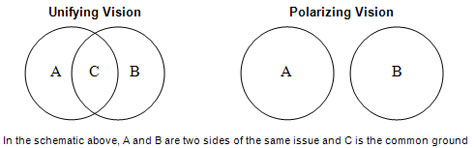 Some see GEO as achievable and desirable while others view it as a utopian fantasy.  The same phenomenon is viewed differently according to an individual’s basic cognitive framework.  Individuals with Unifying Vision tend to automatically see the interrelatedness of things, and have the ability to spontaneously find the common ground, upon which more productive, balanced, and harmonious solutions can be built.  Those with Polarizing Vision have a harder time finding the common ground.  Instead they emphasize one view to the exclusion of other worthwhile perspectives, and develop solutions which do not address the multiple dimensions of an issue.